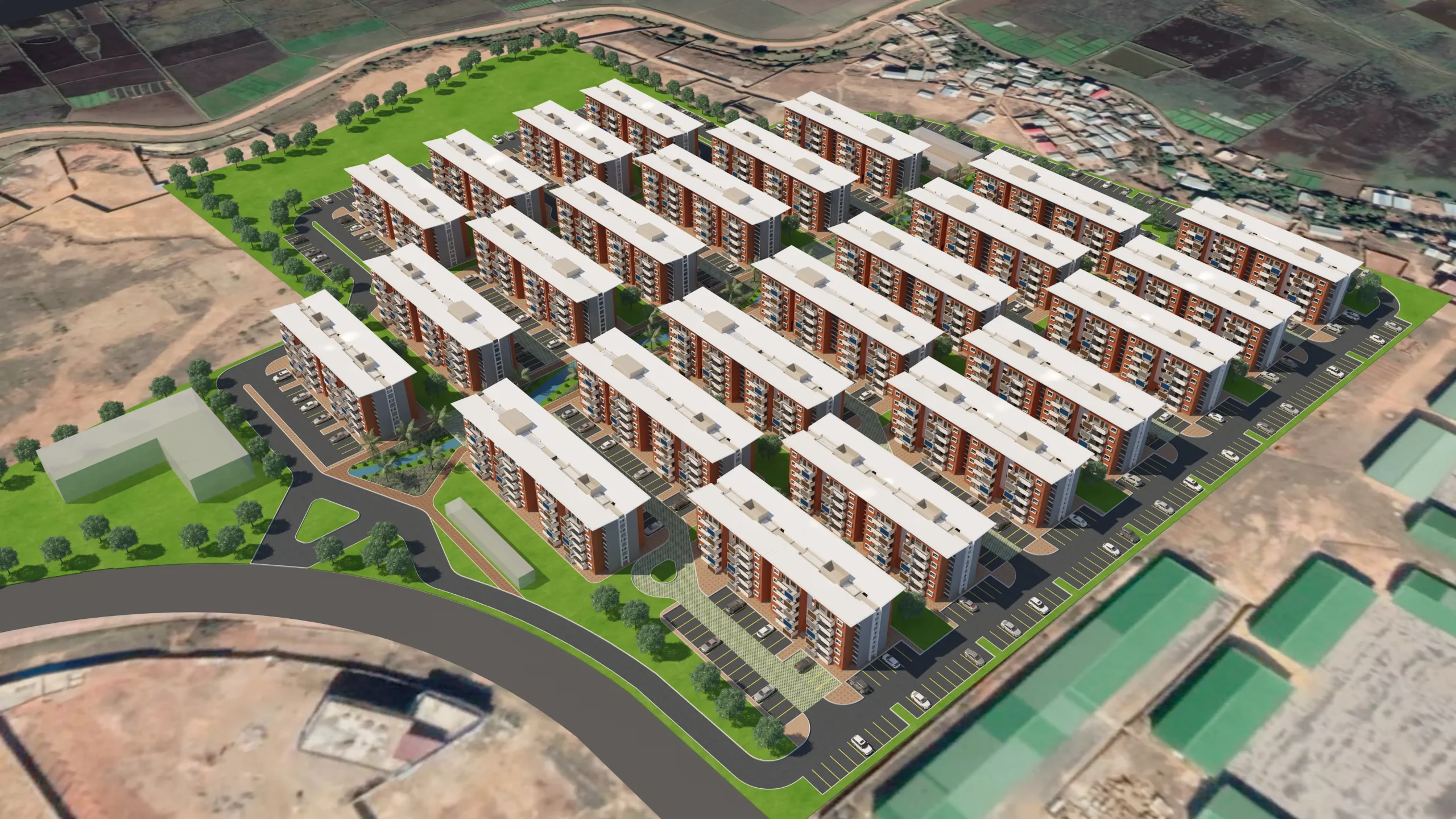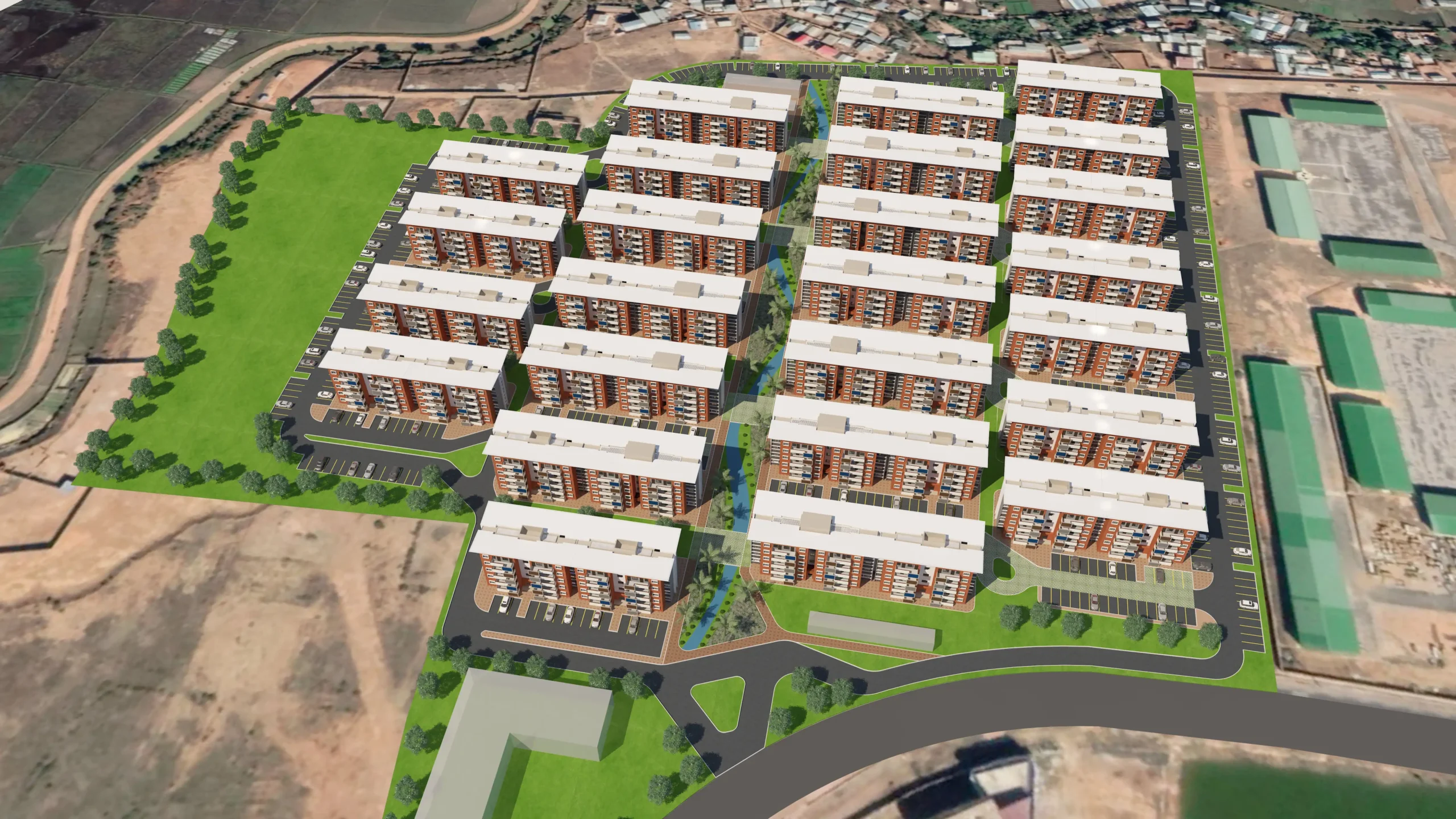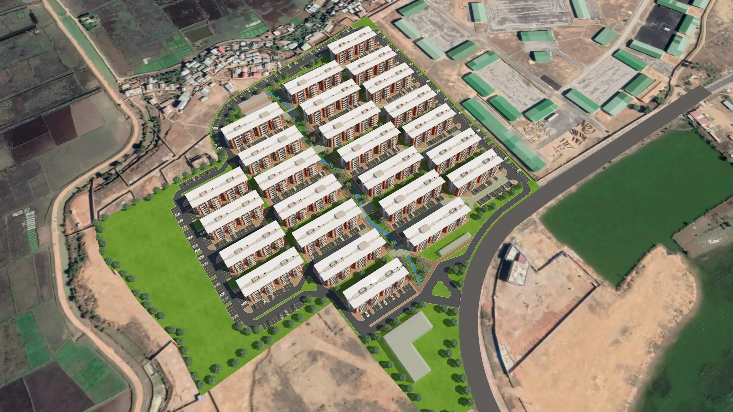This project involves the design and development of a 22-acre land parcel near Ivato Airport in Antananarivo, Madagascar. The objective is to construct 1,000 houses consisting of 1-bedroom, 2-bedroom, and 3-bedroom apartments. The buildings are strategically planned around a central avenue, creating a cohesive layout.
