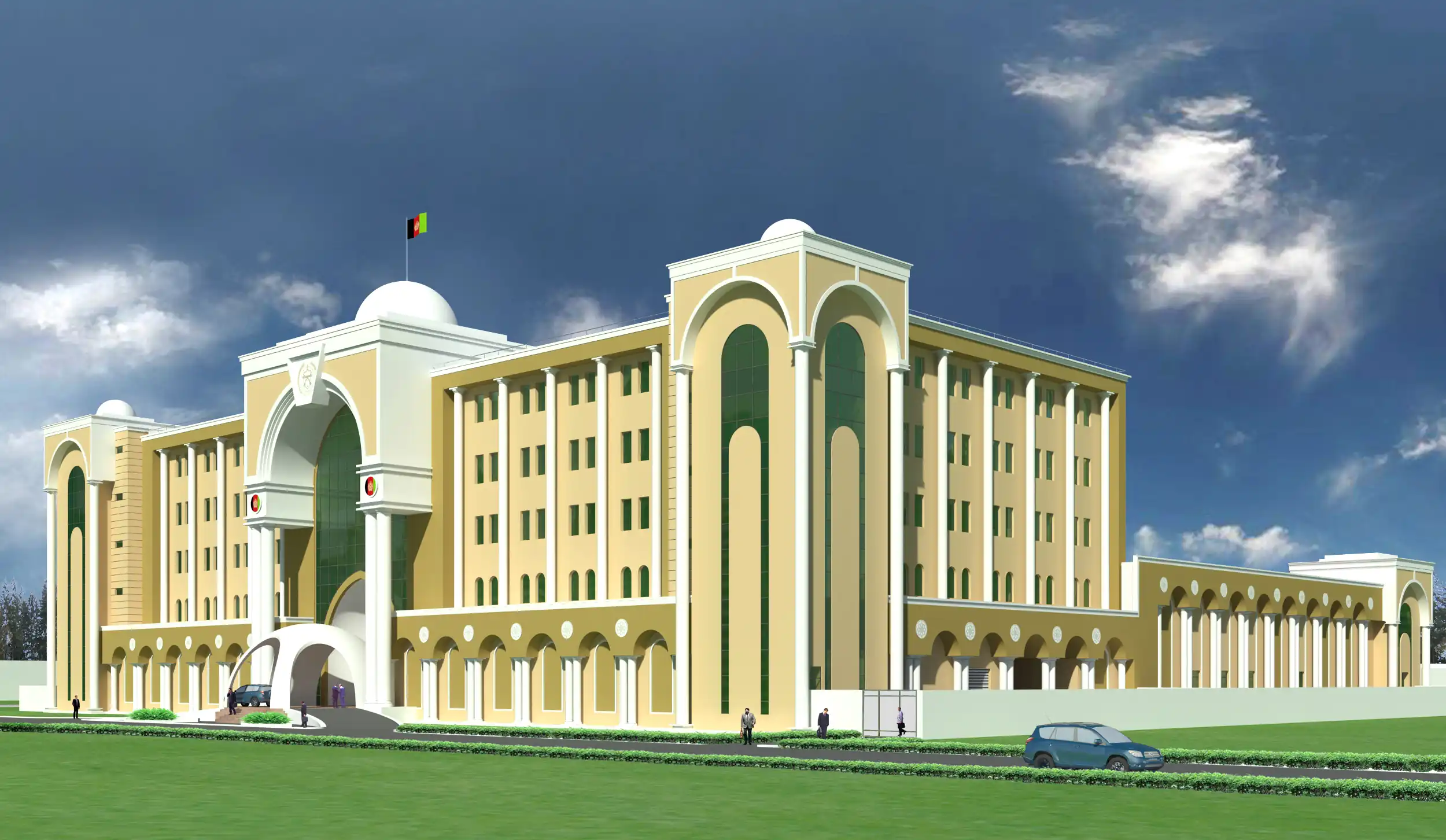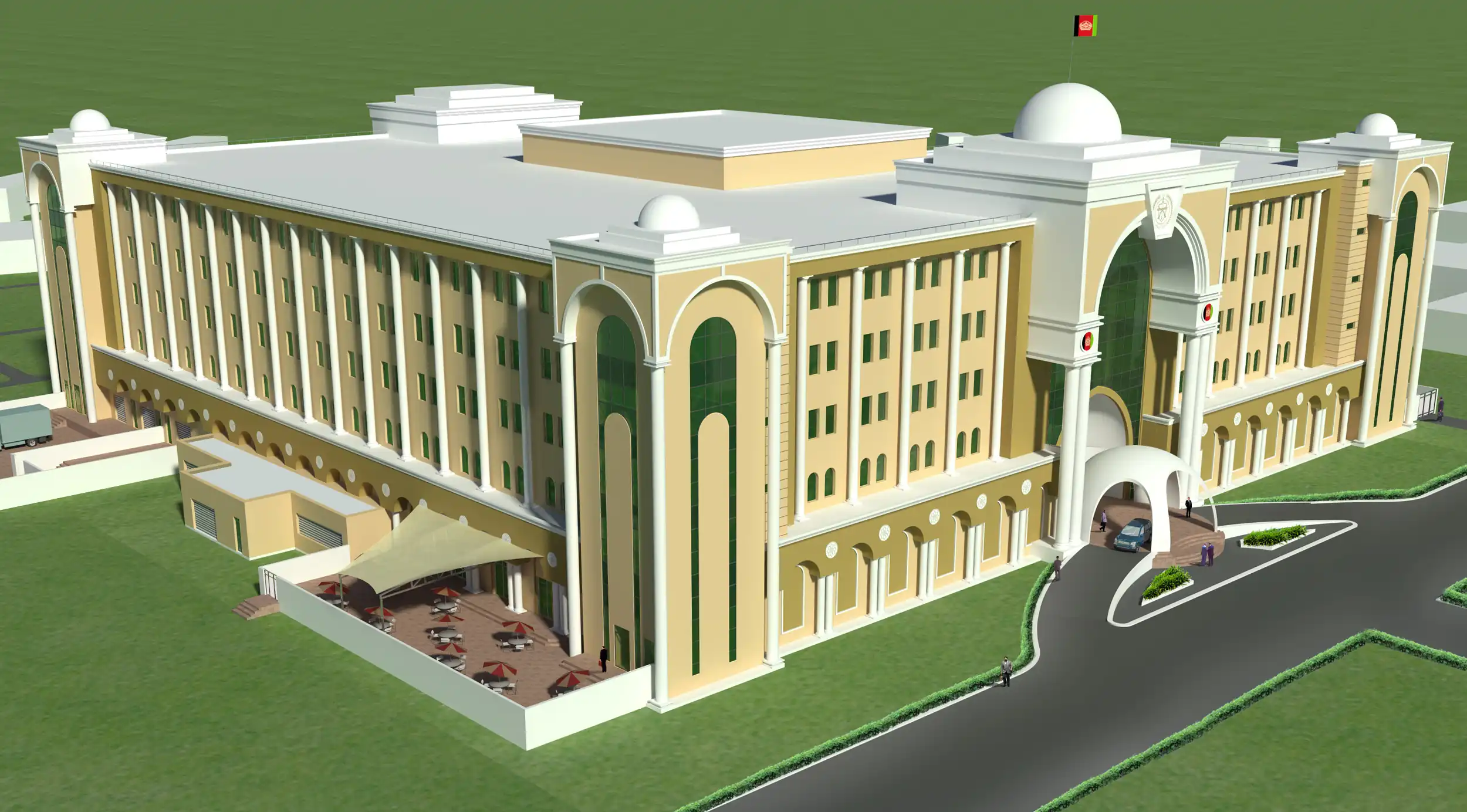The new Ministry of Defence (MoD) headquarters (HQ) is a five-story office building with a partial basement. It will house headquarters and administration spaces, a 1,000-capacity auditorium, and mechanical areas. The purpose of this new building is to replace the existing MoD HQ building. It will be constructed adjacent to the current MoD Headquarters, necessitating the demolition of several existing buildings. The new structure will serve as a significant symbol for the Afghan Nation and its National Army, and it will be designed and constructed accordingly.