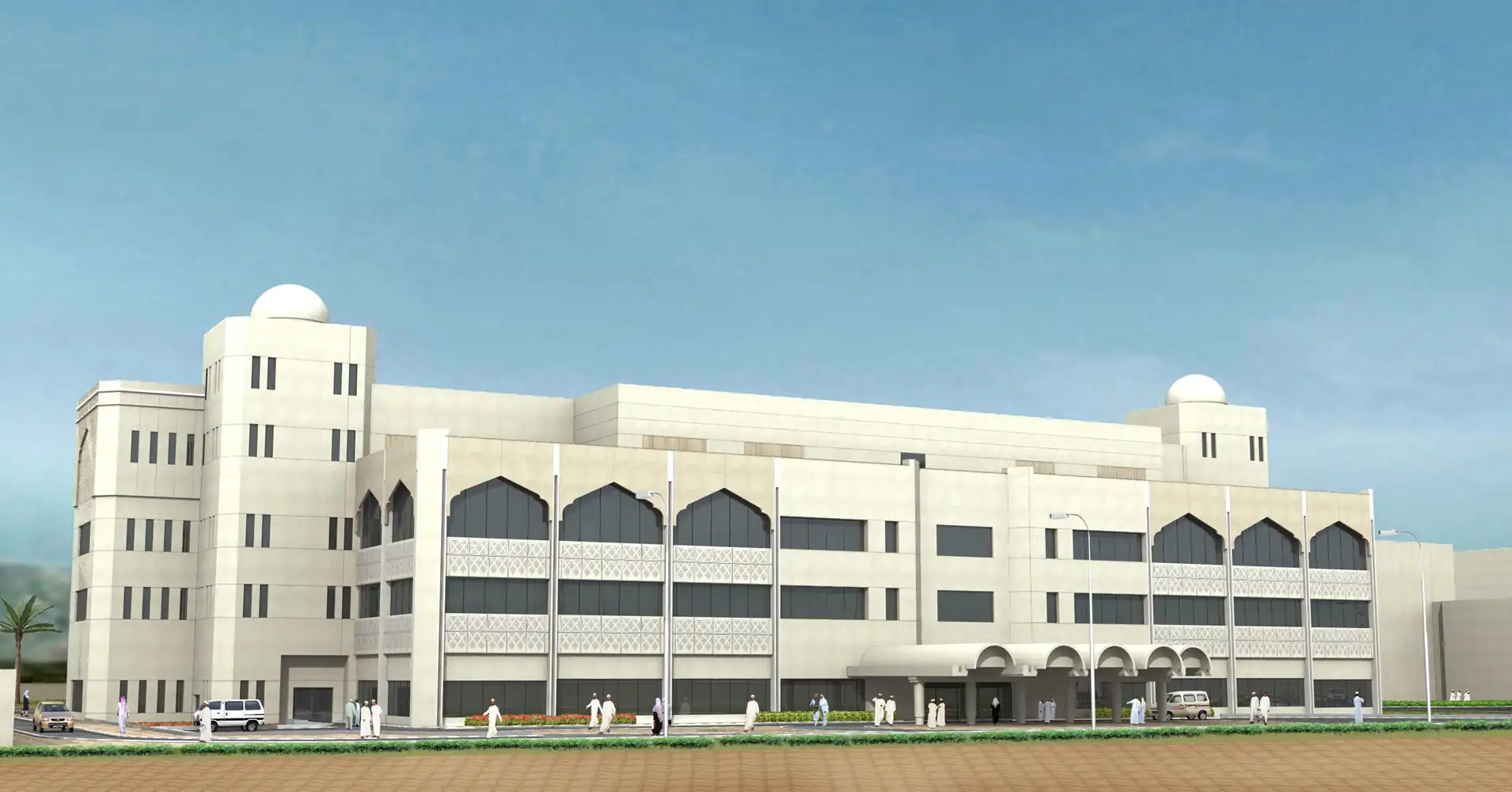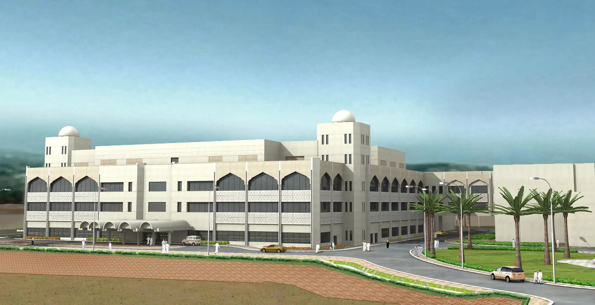 The Ministry of Health in Oman has commissioned a state-of-the-art cardiology facility within the Royal Hospital Complex. This four-story structure is equipped with four operating theaters, cath labs, advanced diagnostic equipment, and in-patient facilities that can accommodate 140 beds. The new block is recognized as one of the most well-equipped medical complexes in the region, constructed to meet the highest medical standards. The design of the facility prioritizes the ease of patient movement and ensures clear separation of circulation for each clinic. The exterior of the building showcases pointed arches and deep-set windows, combining traditional Arabic architectural elements to create an attractive and detailed façade.