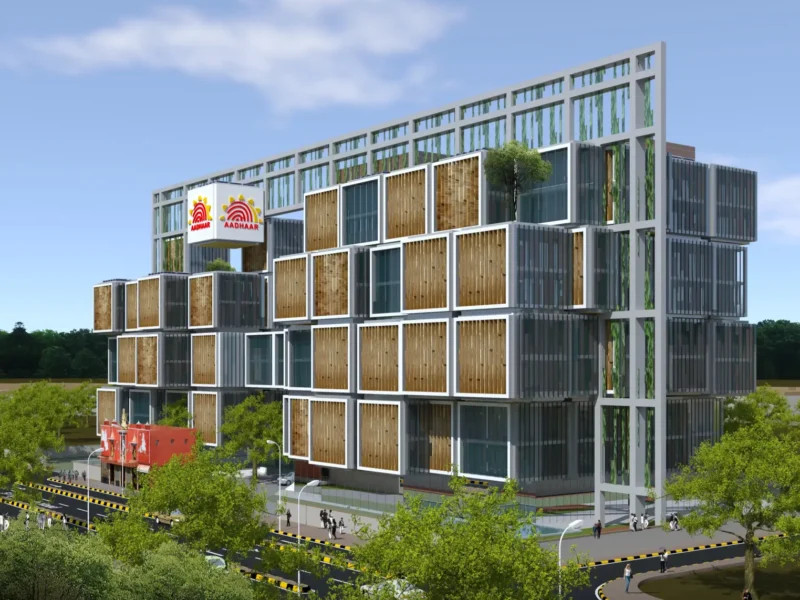 Designed as a GRIHA 5-star rated green building, each face of the component cube is tailored to the climate. Recycled condensed scrap forms vertical louvres on the east, strip windows ...